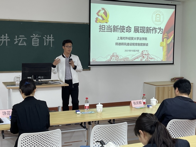 学院党委纪检委员、副院长王金强结合习近平总书记关于教师队伍建设的重要讲话和指示精神,以“担当新使命、展现新作为”为题作了一次师德师风建设的专题报告,要求学院教师从讲政治的高度加强师德师风建设。