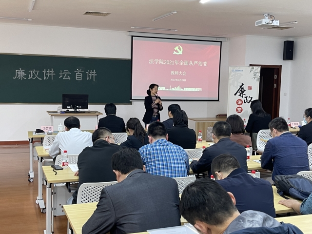 许玫在讲话中指出,学校纪委推出党史学习教育“我为群众办实事”实践项目---廉政讲堂,以法学院为首讲单位,希望学院加强对教师的廉洁从教教育,增强教师纪律意识,不踩雷、不越线;学院教师要发挥学科优势,带头遵法守法,做讲规矩、守纪律、知敬畏、守底线的人民教师;学院要结合工作实际,进一步扎实推进全面从严治党工作。