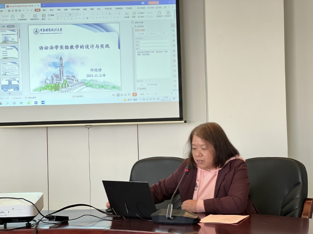 中南财经政法大学法学实验教学中心秘书长、第四届全国财经院校法律职业技能大赛优秀指导教师邓晓静首先进行了题为“诉讼法学实验教学设计与实践”的分享。中南政法大学法学实验教学中心是国家级实验教学示范中心,结合其教授的诉讼法学,邓晓静讲解了如何应用LETS系统(法学实验教学系统)进行诉讼教学实验,对模拟前的准备,实验的开展,实验报告的提交等实验流程进行了完整的介绍,并就法学实验教学系统与法学专业理论课程衔接问题、法学实验教学系统的展示性与可观性等问题进行了深入分享。