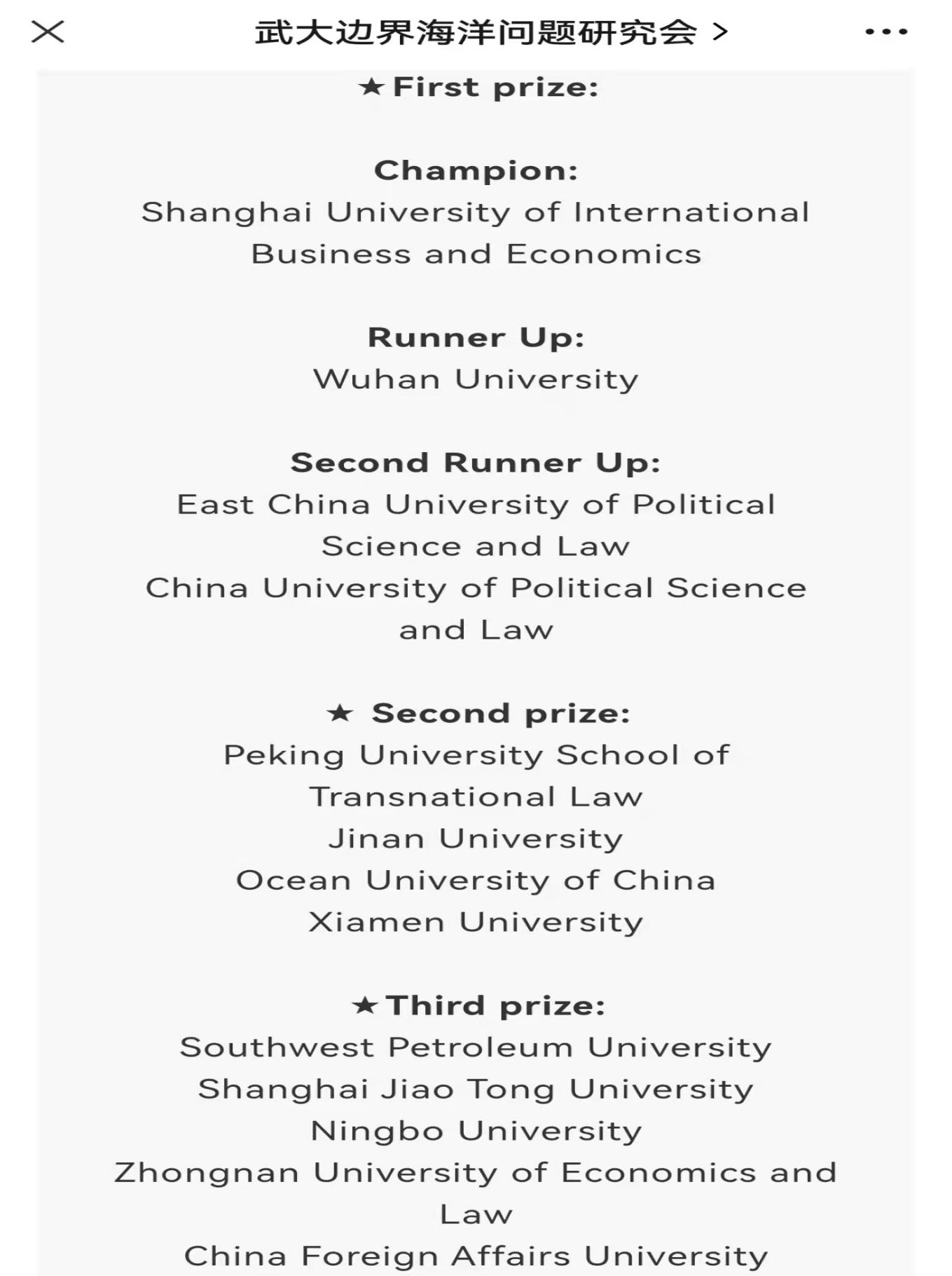 (中国)国际海洋法模拟法庭竞赛由中国海洋法学会、武汉大学中国边界与海洋研究院举办,是中国国内首创的国际性全程英文模拟法庭竞赛,也是全球首个国际海洋法模拟法庭竞赛。该比赛选取海洋法的热点问题,模拟适用《联合国海洋法公约》第十五部分规定的国际海洋法法庭、国际法院和《公约》附件七仲裁程序,旨在为参赛同学提供学习和探讨当前海洋法领域热点和前沿问题的平台和机会。决赛由包括国际法庭法官及国际法、海洋法领域专家组成的裁判小组裁决,在国际上同领域竞赛中规格最高、参赛规模最大。比赛以英文为官方语言,采用提交书状和开庭陈述辩论的形式决出胜负。通过参与海洋法的训练和模拟,学生的法律功底、语言能力、法律实践水平和实战能力能够获得很大提高。