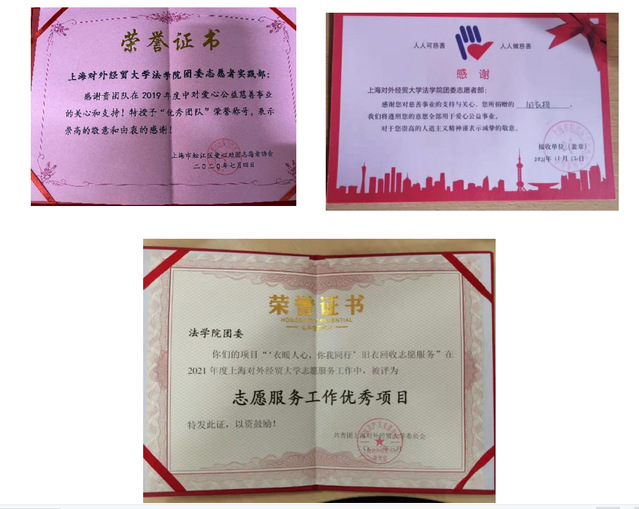 “衣暖人心,你我同行”旧衣回收活动开设自2020年,至今已开展了6次,覆盖全校师生500余人,共收集旧衣2000余件,统一捐赠给上海市松江区爱心助困志愿者协会,获得热烈反响和社会赞誉。在2019和2020年,法学院团委志愿者实践部被评选为爱心公益慈善事业的“优秀团队”。此外,“衣暖人心,你我同行”旧衣回收志愿服务在2021年度必赢626net入口首页志愿服务工作中被评为志愿服务工作优秀项目。