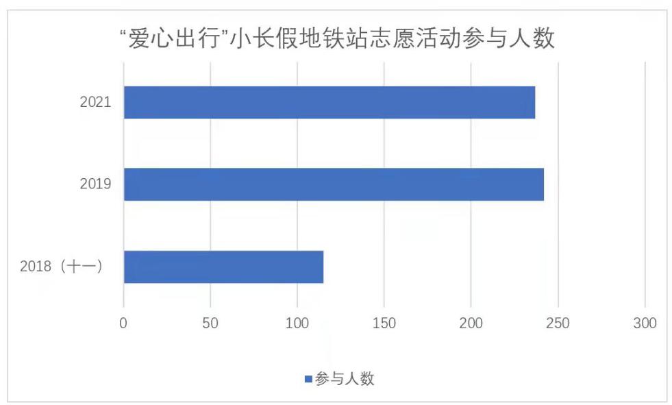 “爱心出行”小长假地铁站志愿活动开始于2015年10月,距今已经有6年多的时间共计千余人次参与其中,2021年共有277人次参加活动。作为校级志愿者活动之一,“爱心出行”小长假地铁站志愿活动迸发出了新的活力。越来越多的青年志愿者们积极选择参与志愿服务活动,用行动践行着地铁志愿活动的内涵与价值。