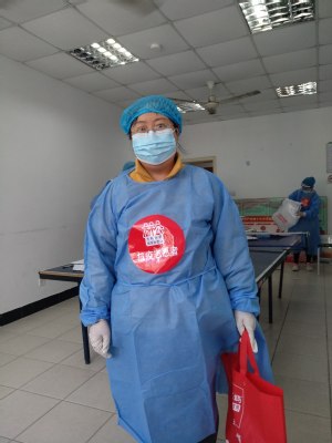 身穿大白服,做核酸检测志愿者,核对信息、扫码、发放检测管,一天连续站了七小时,她没有喝一口水;看到小区通知要做抗原测试,主动到居委报到参与抗原采样试剂逐户派送;了解到不少居民存在生活物资短缺情况,立刻组织志愿者一同联系团购物流,及时帮助200多个家庭缓解了生活困难。用使命和担当扛起抗疫旗。