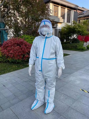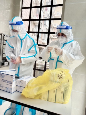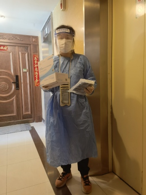 一早跟随物资车穿梭在各个楼栋,清点防护服、分发手套口罩等物资。穿着防护服、带着手套清点物资并不是容易,她客服困难,一丝不苟,确保物资发放到位。回家路上,她又主动帮助楼栋志愿者分发抗议试剂。
