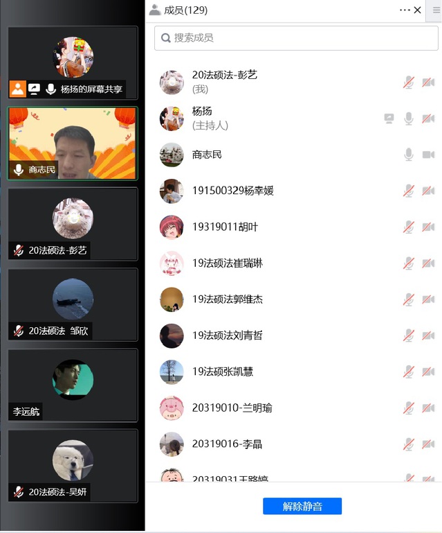 黄静向同学们通报了当前社会层面复杂和严峻的疫情防控形势,对学校、学院在准封闭期间对保障学生身心健康的各项关心关爱举措进行了介绍,并强调了特殊时期,校园安全和稳定更加需要师生共同努力、相互支持与协力配合。她对收集到同学们近期较为关注的问题进行了针对性解答。同时也希望同学们作为法学院研究生,要在遵纪守规上走在前,要在理性思维上走在前,要在服务他人中走在前,既要保持对疫情防控极端重要性的清醒认识,又要做好时间管理,合理安排作息,保持身心健康。
