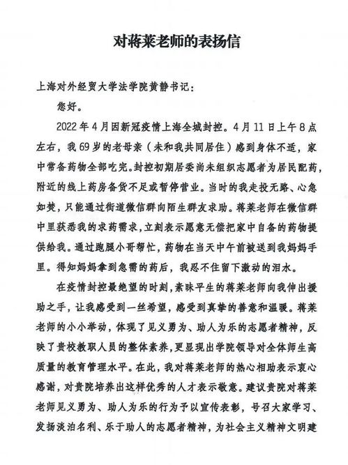 信中表示,在4月上海疫情封控初期,该居民独居的高龄母亲家中常备药用尽,社区尚未组织居民配药服务,心急如焚的她只能通过街道微信群向陌生群友求助。蒋莱老师第一时间伸出援手,无偿提供家中自备药,为素昧平生的居民解决燃眉之急。