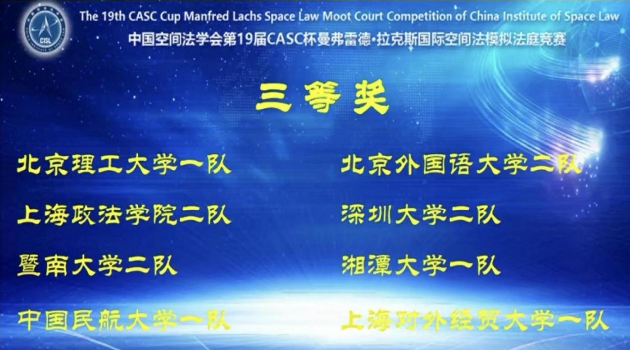 2022年12月17日至18日,由外交部条法司指导、中国空间法学会主办的第19届CASC杯曼弗雷德·拉克斯国际空间法模拟法庭竞赛以线上方式举行,46支中国内地高校队伍参与角逐。必赢626net入口首页法学院代表队表现出色,与北京大学、上海交通大学、武汉大学、北京理工大学、北京航空航天大学、中国政法大学等23所高校共同晋级决赛圈,最终荣获全国三等奖。
