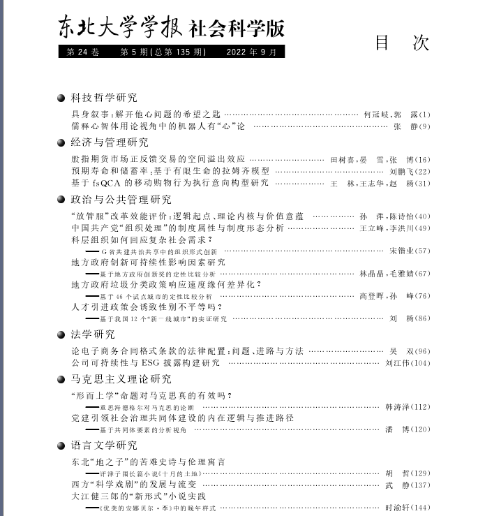 《论电子商务合同格式条款的法律配置:问题、进路与方法》,载于《东北大学学报(社会科学版)》2022年第5期