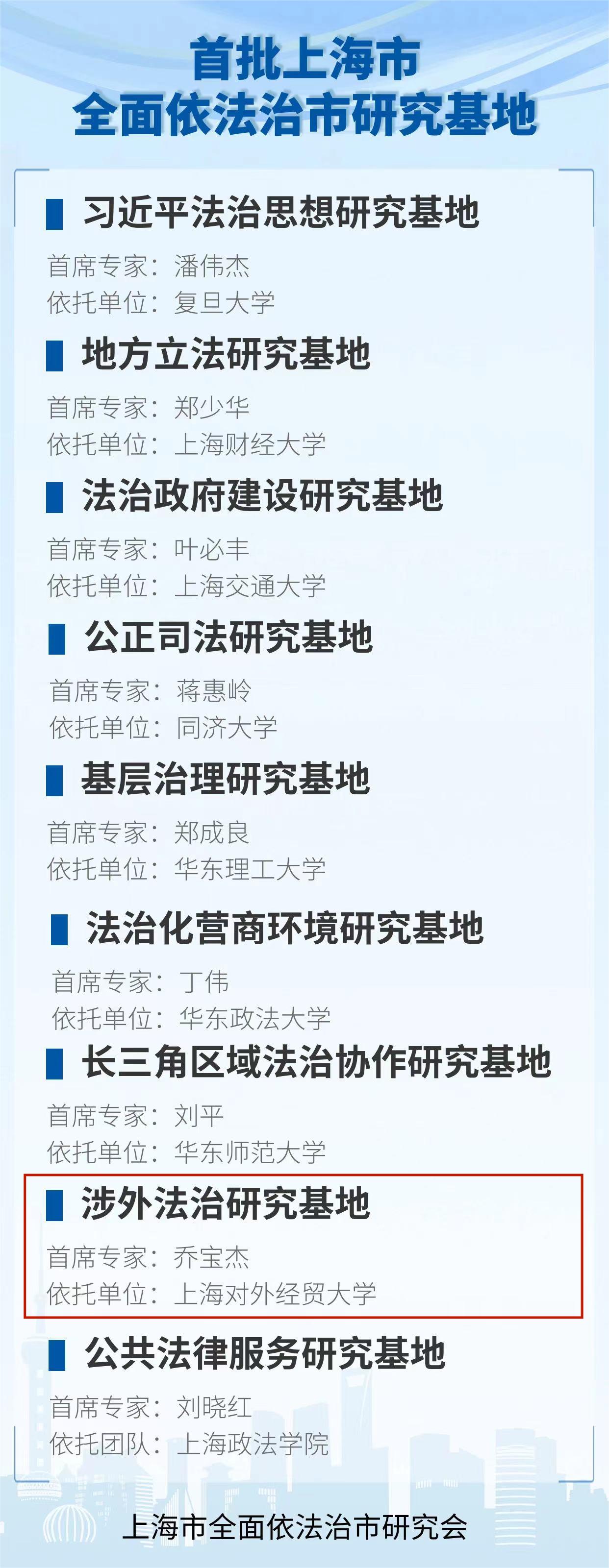 近日,上海市全面依法治市研究会公布了首批上海市全面依法治市研究基地评审结果,必赢626net入口首页“涉外法治研究基地”成功获批,法学院院长乔宝杰教授担任首席专家。
