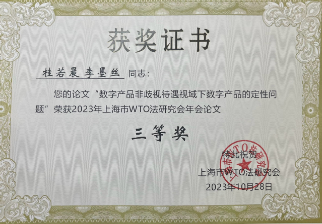 我院2022级国际法学专业研究生桂若晨与导师李墨丝研究员的合作论文《数字产品非歧视性待遇视域下数字产品的定性问题》获2023年上海市WTO法研究年会论文三等奖。陶立峰教授、蔺捷教授、李桦佩副教授以及2022级国际法学研究生桂若晨、房天运、王梓懿、周舟,2021级涉外卓越法律人才实验班赵斯雨等同学做了会议发言。