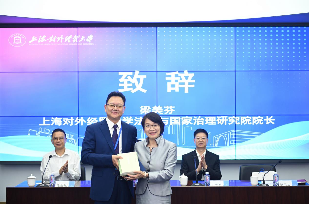 梁美芬作为香港首位以英文讲中国法律的女学者,见证了国家法治改革的巨大进步。她强调,法治与国家治理是关系国家长远发展和人民福祉的命题和重大课题。她分享了自己人生经历及对中国提升国际话语权的重要性认识。作为研究院首任院长,她表示对研究院未来发展充满信心,将以此次揭牌仪式和研讨会为契机,推进沪港两地学者的交流合作,为国家和社会的法治与现代化治理事业做出贡献。随后,梁美芬将自己带领团队编著的中英文“一带一路”系列法律著作赠予法学院。