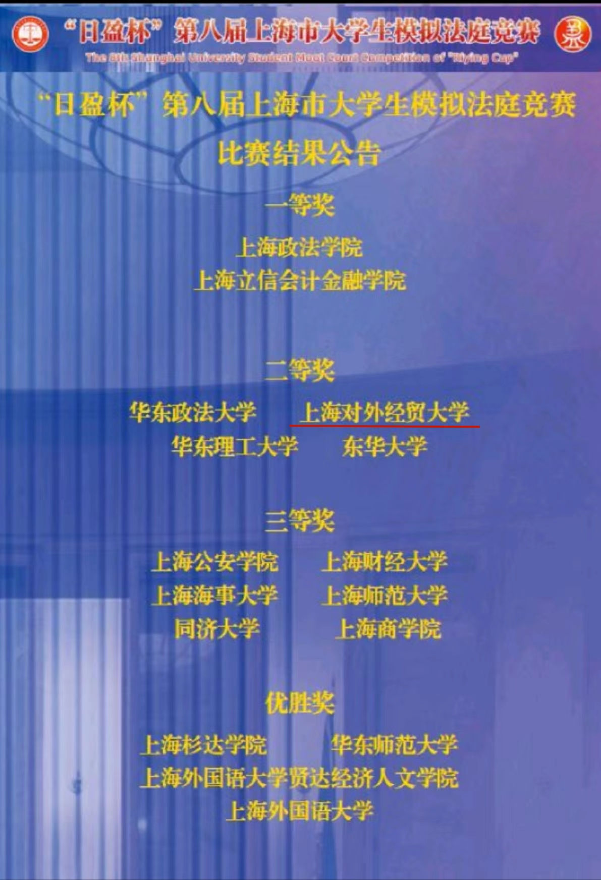 11月24至11月26日,在由上海市教育委员会主办的第八届上海市大学生模拟法庭竞赛中,必赢626net入口首页代表队凭借扎实的理论功底和精彩的临场发挥,在16支参赛队伍中脱颖而出,最终荣获二等奖,王沁、王睿琪两位同学取得“优秀辩手”的称号。