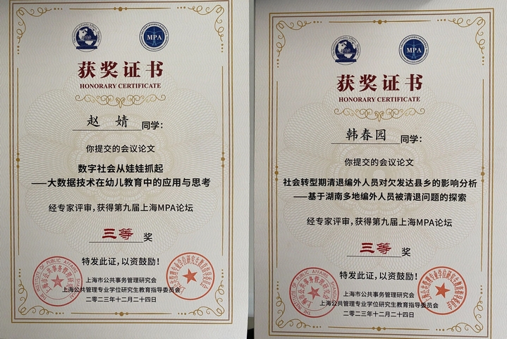 2023级MPA赵婧同学(指导老师:邵德兴)撰写论文《数字社会从娃娃抓起——大数据技术在幼儿教育中的应用与思考》,韩春园同学(指导老师:吴晓锋)撰写论文《社会转型期清退编外人员对欠发达县乡的影响分析——基于湖南多地编外人员被清退问题的探索》,在第九届上海MPA论坛上均荣获三等奖。