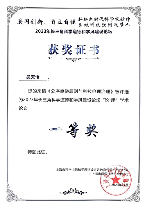2021级国际法学专业研究生吴天怡同学(导师:朱怀念)撰写论文《公序良俗原则与科技伦理治理》,在2023年长三角科学道德和学风建设论坛上荣获学术论文一等奖。