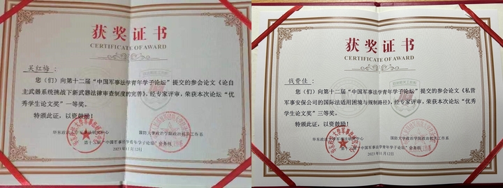 2021级国际法学专业研究生吴红梅同学(导师:陶立峰)撰写论文《论自主武器系统挑战下新武器法律审查制度的完善》、2023级法律硕士(法学)研究生钱费佳同学(导师:吴宁铂)撰写论文《私营军事安保公司的国际法适用困境与规制路径》,在第十二届“中国军事法学青年学子论坛”上分别荣获“优秀学生论文奖”一等奖和三等奖。