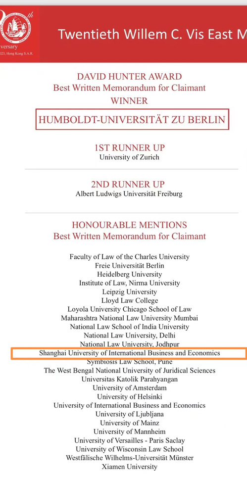 2023年 第20届Vis East Moot 申请人最佳书状荣誉提名奖