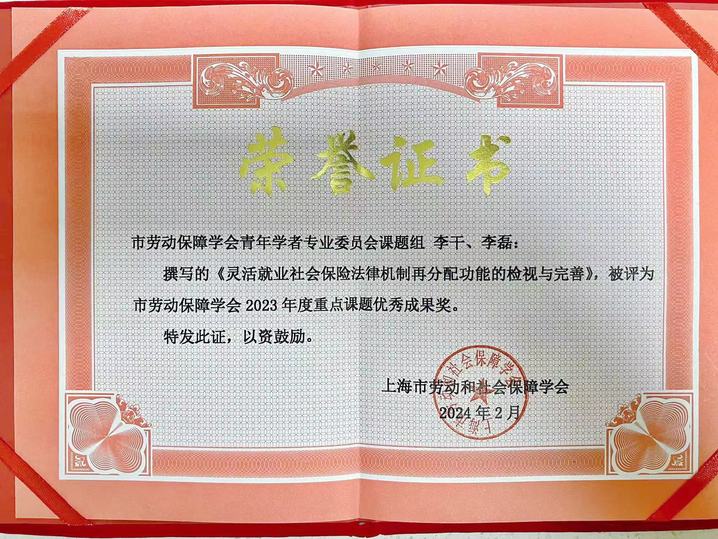 3月26日,上海市劳动和社会保障学会召开第九届理事会第二次会议暨会员代表大会,会上对学会2023年度获奖课题成果予以表彰。由我院李干(理事)、李磊(常务理事)两位教师主笔的“灵活就业社会保险法律机制再分配功能的检视与完善”获2023年度重点课题优秀成果奖。