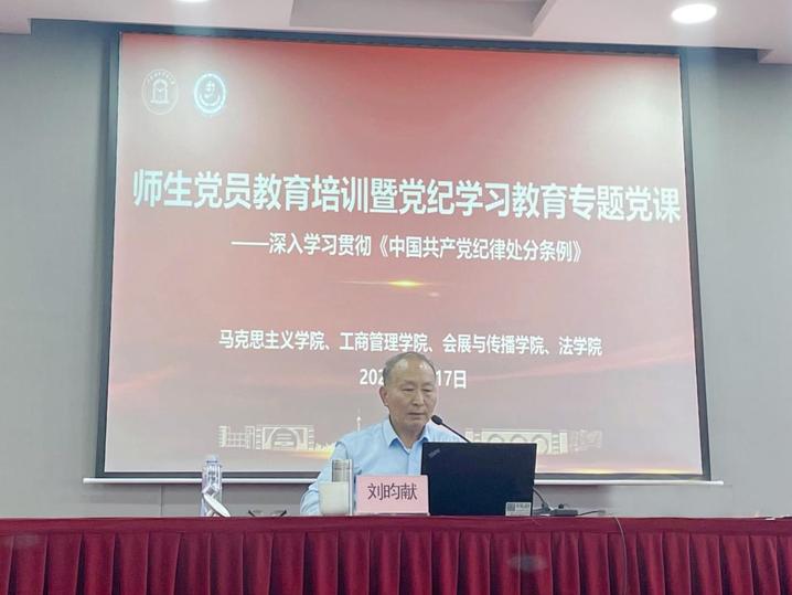 此次专题党课邀请中国浦东干部学院中国特色社会主义研究院原副院长、博士生导师刘昀献教授授课,带领师生党员深入学习贯彻《中国共产党纪律处分条例》。党课由马克思主义学院党总支副书记(主持工作)刘海泉主持。