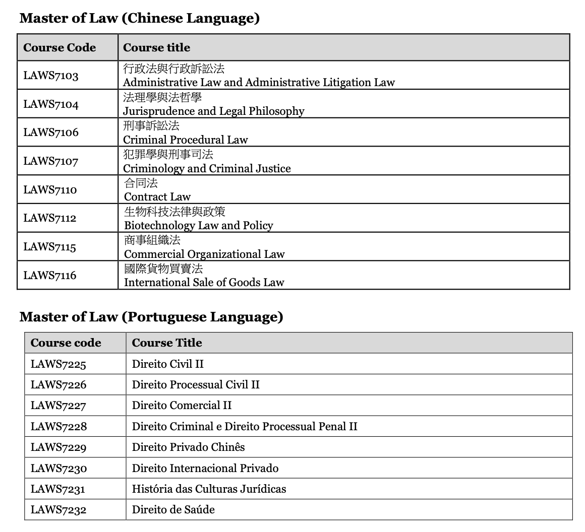 澳门大学法学院是澳门历史最悠久的法学院。学院提供中英葡三语教学,课程涵盖欧盟法、国际法和比较法等领域。学士学位课程的目标是培养熟悉澳门特别行政区法律制度的法学学生,而硕士及博士课程旨在培养能专业从事澳门法、比较法、欧洲法及国际法理论研究及教学的法学研究生。学院拥有来自中国澳门特别行政区、中国大陆、葡萄牙等国家和地区的优秀师资队伍,此外还定期邀请来自欧洲和其他国家/地区的一些杰出学者担任客座教授。学院在中国澳门特别行政区法律和法学研究本地化领域发挥了非常重要的作用,中国澳门特别行政区的公务员、双语法官、检察官和法学专家中多数毕业于该法学院。