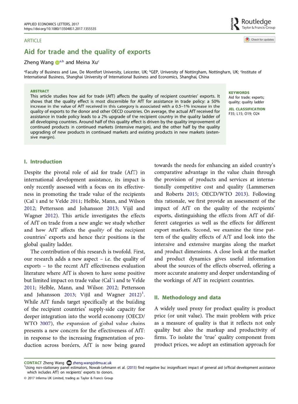 Effects of Trade Facilitation Measures on Trade Between China and Countries Along the Belt and Road Initiative” in Wenxian Zhang, Alon, I., Lattemann, C.. (Eds). “China's Belt and Road Initiative: Changing the Rules of Globalization