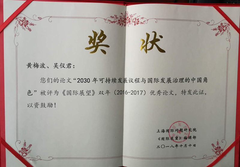 黄梅波 吴仪君 | 论文:2030年可持续发展议程与国际发展治理中的中国角色[J]. 国际展望, 2016, 8 | 上海国际问题研究院 | 《国际展望》双年(2016—2017)优秀论文 | 优秀论文奖 | 2018年10月 |