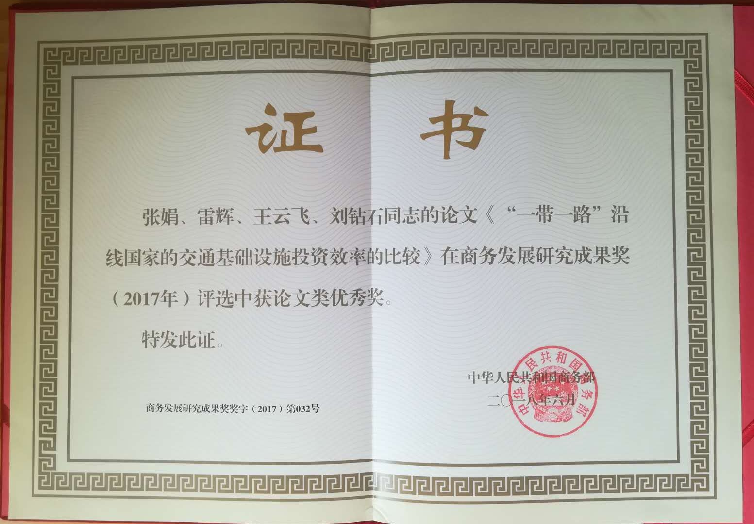 张娟、雷辉、 王云飞、刘钻石 | 论文《“一带一路”沿线国家的交通基础设施投资效率的比较》 | 商务部 | “商务发展研究成果奖”(2017年) | 论文类优秀奖 | 2018年6月 |