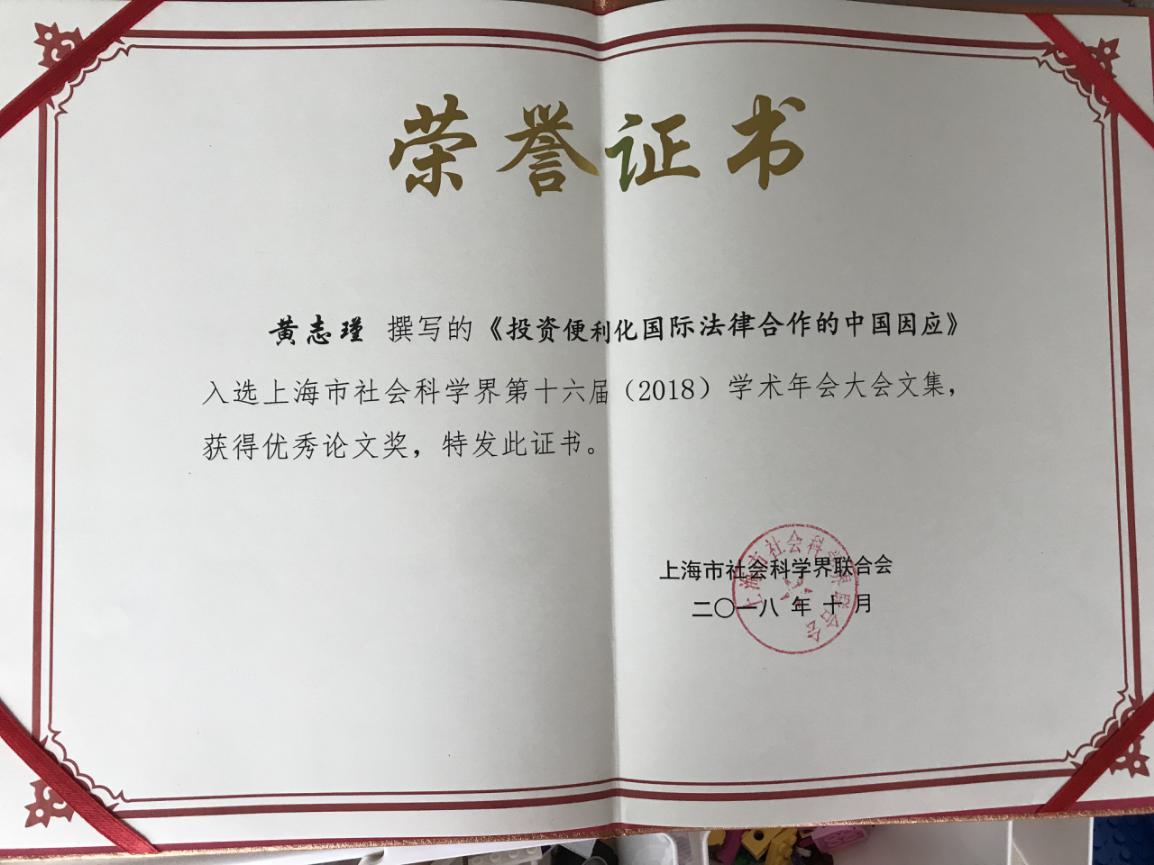 黄志瑾 | 论文《投资便利化国际合作的中国因应》 | 上海市社科联 | 上海市社科第十六届学术年会优秀论文 | 优秀论文奖 | 2018年6月 |