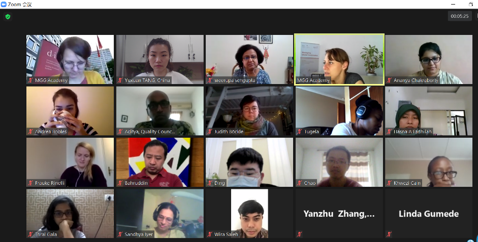 全球治理(MGG)学会是由德国发展部、德国外交部和德国外交关系委员发起,为来自新兴国家和欧洲的年轻专业人士设计的一个高级别跨国界对话和培训项目。其首要目的是支持应对全球挑战的未来变革者,这个项目融合了讲授相关全球治理挑战的知识、参与国际相关政策实践以及致力于国际发展的全球领导力培训。唐毓璇助理研究员参加了2020年的全球治理学会项目,在此过程中,深入了解和参与正在进行的国际发展和全球治理研究以及相关政策项目的讨论,对促进实施联合国2030年议程和具体目标实施方案的制定做出贡献。同时,针对当前全球经济社会发展的八个重大议题,于2020年9月28日至10月2日参加了多场视频会议,与来自巴西、中国、印度、印度尼西亚、墨西哥、南非、荷兰和德国的24名与会者参加了会议,共同探讨全球化时代机遇和挑战,并讨论当今世界的全球治理,并获得了相关证书。