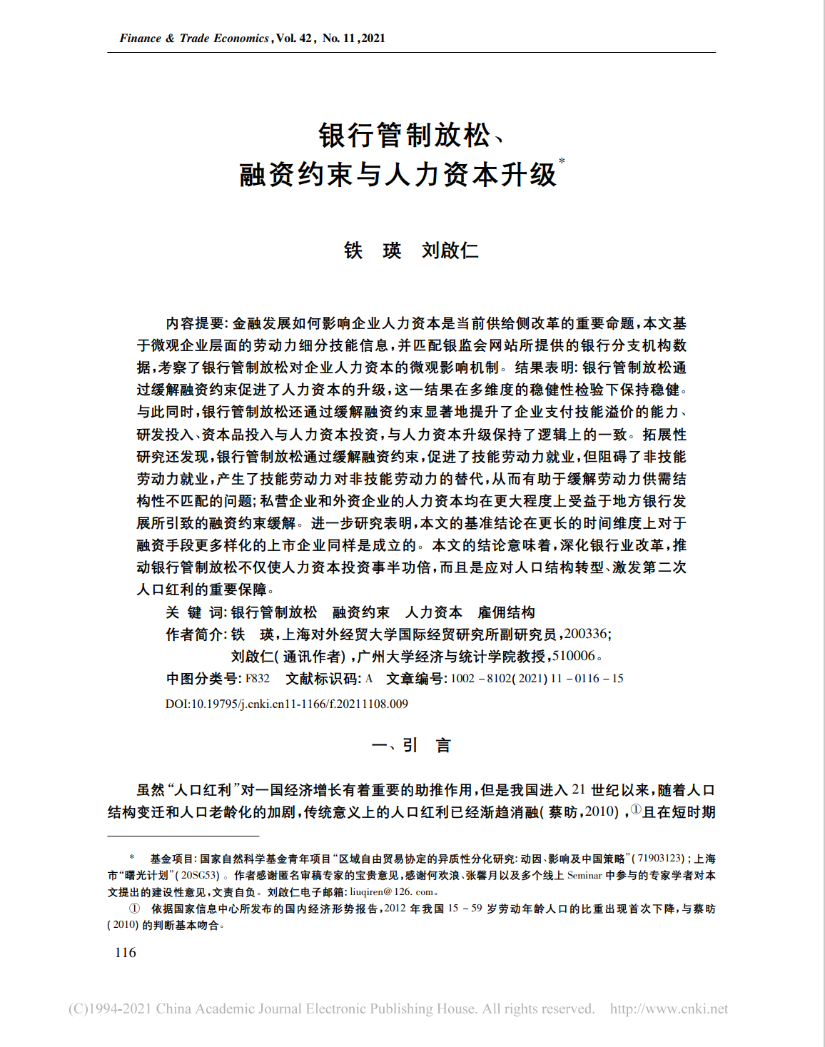 铁瑛、刘啟仁,“银行管制放松、融资约束与人力资本升级”,财贸经济,2021年第11期
