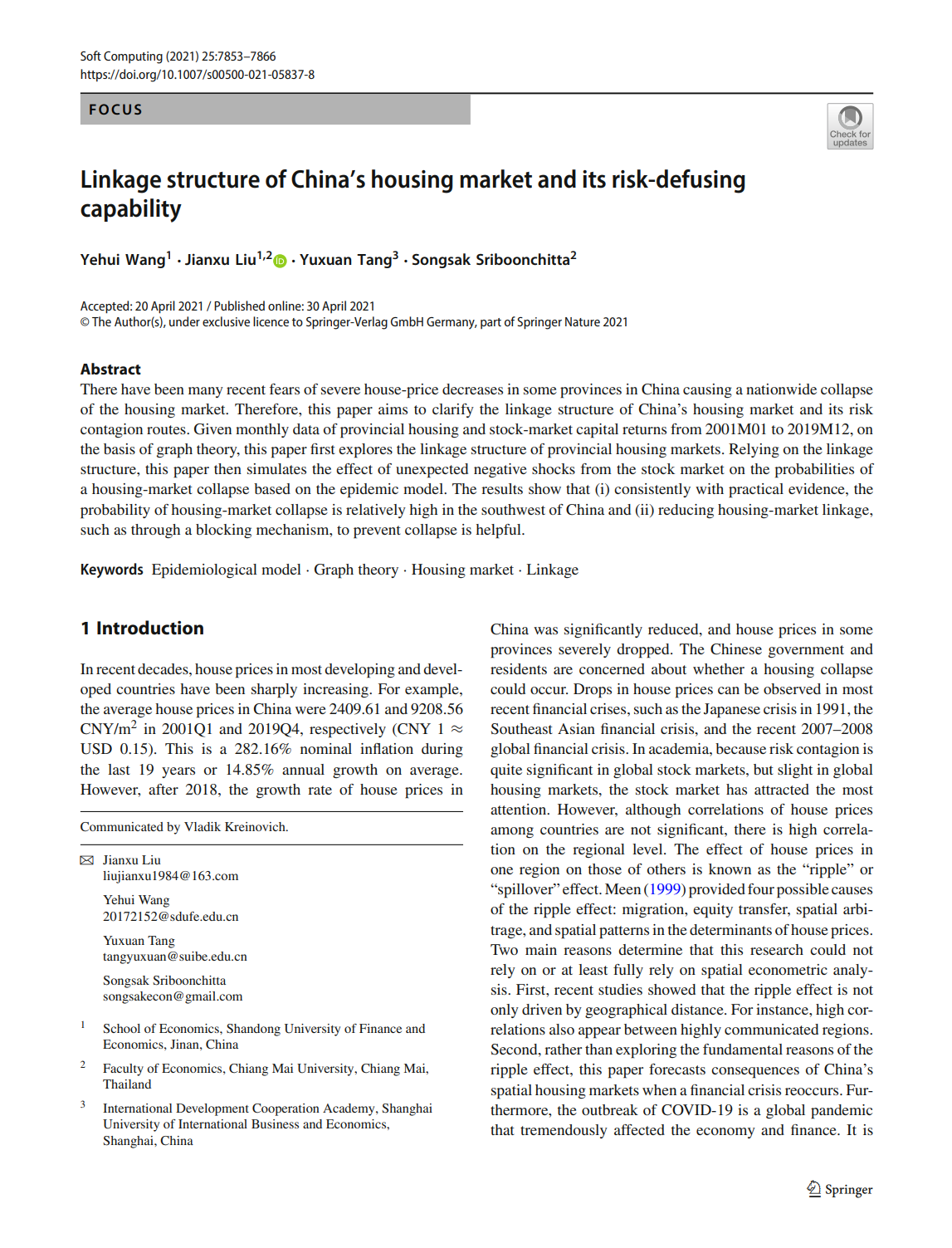 Wang, Yehui;Liu, Jianxu;Tang, Yuxuan; Sriboonchitta;Songsak, Linkage structure of China’s housing market and its risk-defusing capability,Soft Computing, 2021,25(12):1-14。