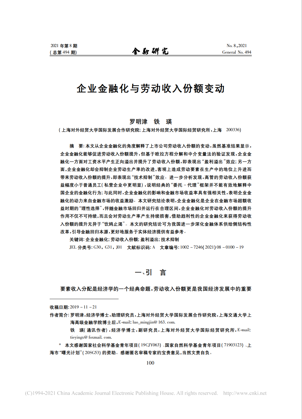 罗明津 铁瑛 | 企业金融化与劳动收入份额变动 | 金融研究 | 2021(08) | 100-118 | A2 |