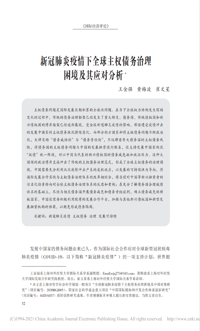 王金强、黄梅波、崔文星:“新冠肺炎疫情下全球主权债务治理困境及其应对分析”, 国际经济评论, 2021年第4期