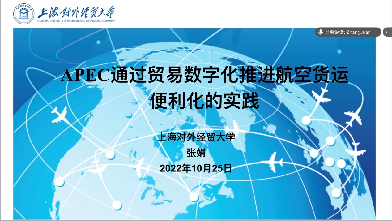 10月25日,张娟副研究员应邀参加 “基于电子口岸推进亚太供应链互联互通实践报告会”并以“APEC通过贸易数字化推进航空货运便利化的实践”为题发言