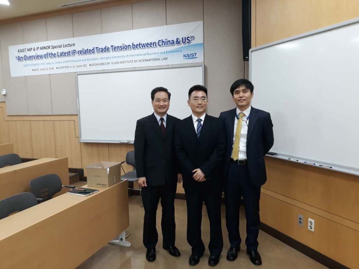 访问期间,在韩国科学技术院知识产权项目部做学术报告。题目为《An Overview of the Latest IP-Related Trade Tension between China &US》,就目前引发全世界关注的中美双边贸易中的知识产权摩擦进行了介绍和分析,并在学术报告结束后与参会的师生进行较长时间的交流互动,受到了较好的评价。在学术会议结束后,又与该校知识产权项目部主任朴盛必教授进行了较长时间的谈话交流,就共同关心的学术问题和今后可能开展的合作等事项进行了初步交流商讨。
