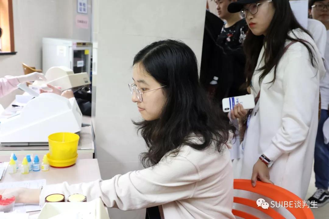 4月19日上午,贸易谈判学院的11名本科生和研究生学长学姐们,在学院党总支副书记徐峰老师、辅导员辛雅文老师以及医护人员的陪同下,一起来到了松江血站,参与2019年度无偿献血活动。