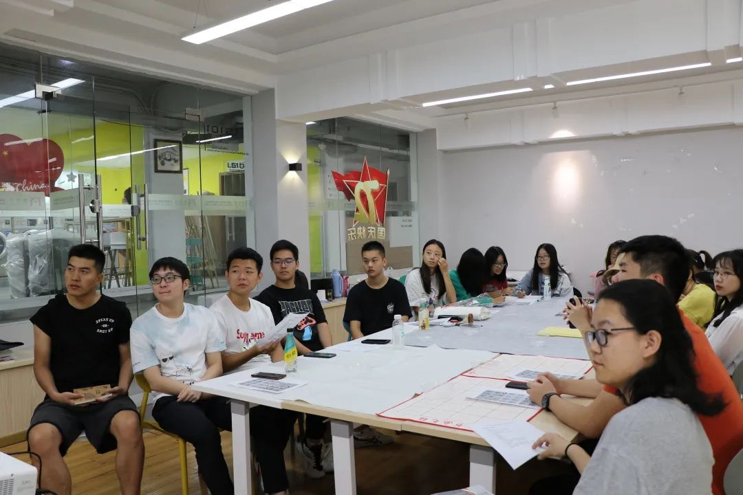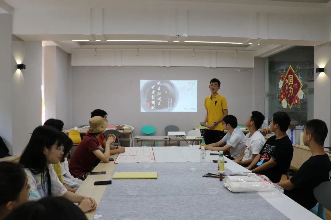 当天上午,伴着明媚阳光,二十余位同学齐聚梦享家多功能室,围坐一起,研习书法,喜迎国庆。本次活动以书法课程教学和临摹创作相结合的形式进行,由学院文体部部长李味佳同学担任主讲人。他是上海市青少年书法家协会会员,至今已从事书法学习十余年。