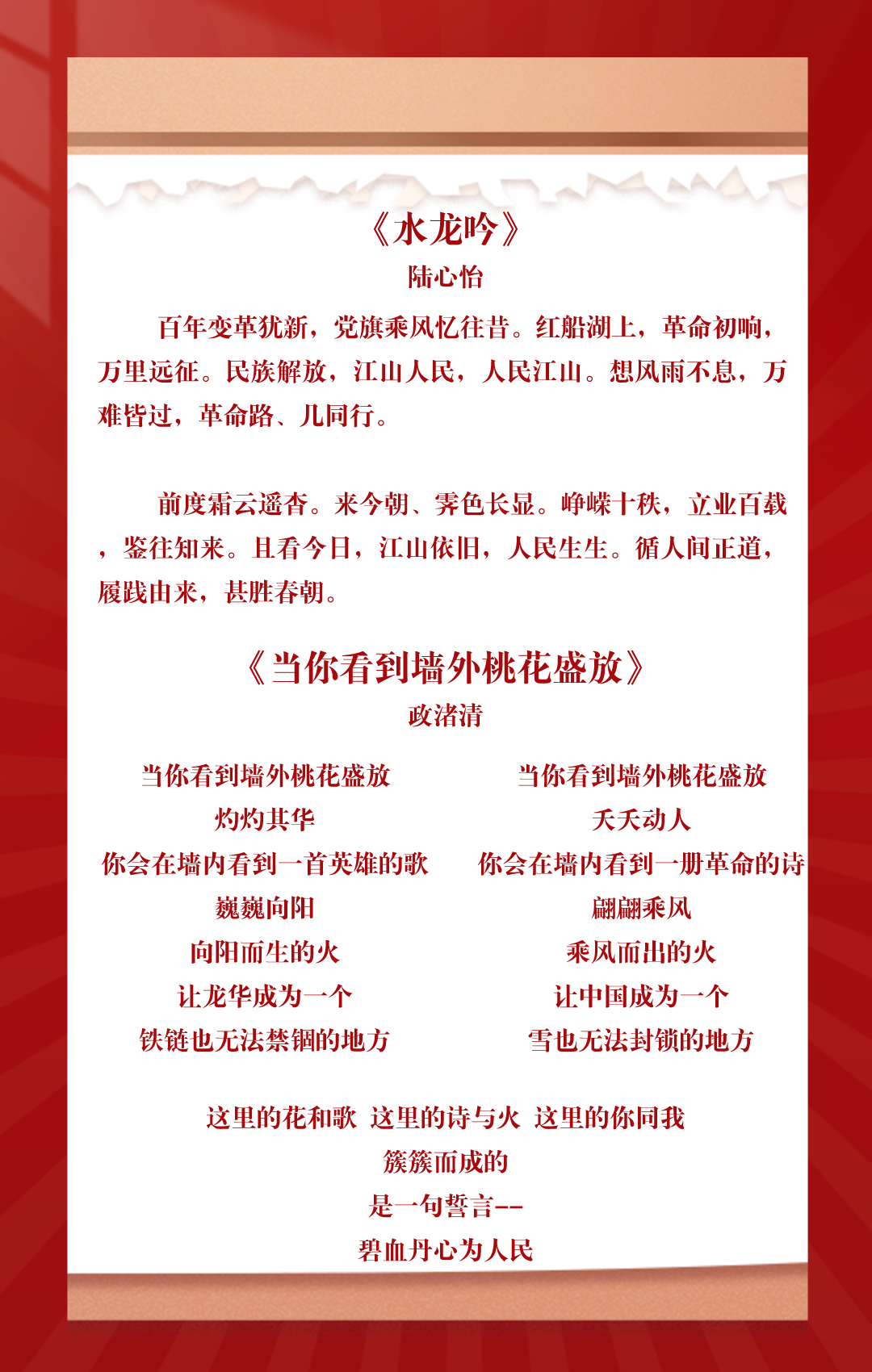国际经贸规则1901支部团员填词《水龙吟》,创作诗歌《当你看到墙外桃花绽放》,表达了对建党百年的礼赞。