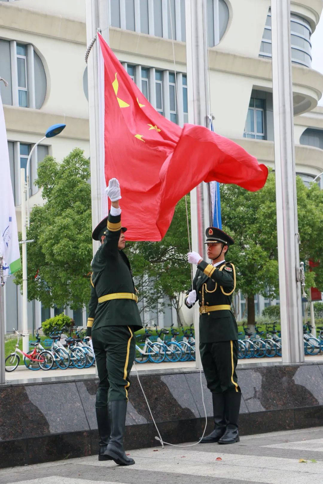 首先,由学校国旗护卫队的同学庄严护送国旗入场,升旗手扬起国旗,鲜艳的五星红旗在庄严的国歌声中缓缓升起。国旗升起之后,校旗也在老师与同学的注目中升起,迎风飘扬。