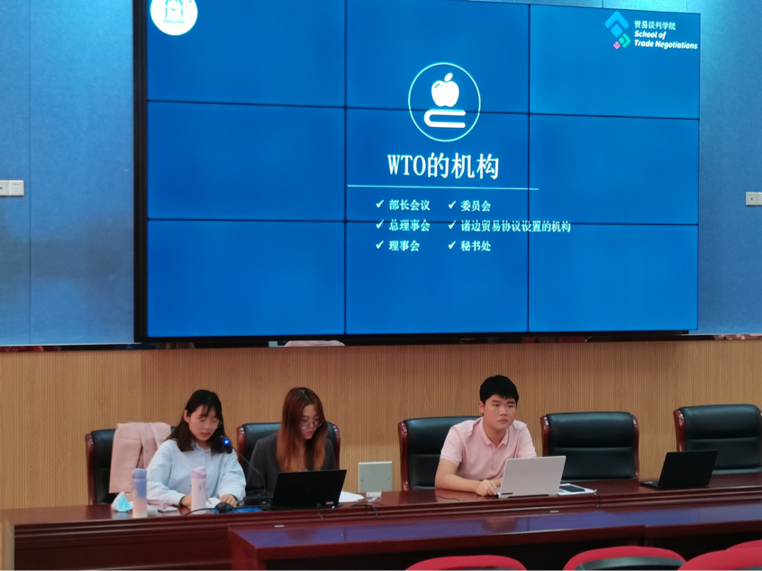 之后,周昕和周捷两位同学为在座学生介绍了世界贸易组织法,即WTO法。对此,两位同学从中美关系入手,具体介绍了世界贸易组织(WTO)的历史、机构、成员权利与义务、争端解决机制等一系列知识点。在普法过程中,两位同学采用了“海龟案”等各种例子使得所讲述的知识更加生动形象,浅显易懂。