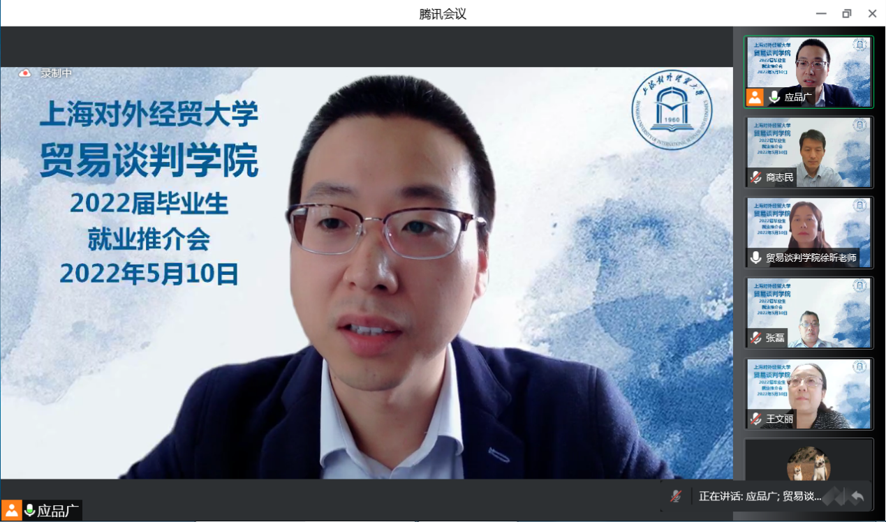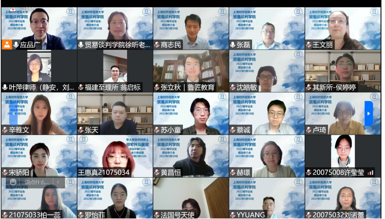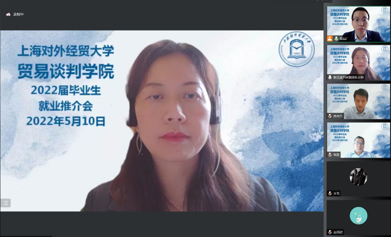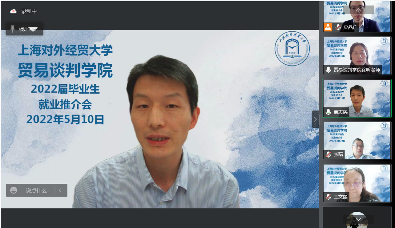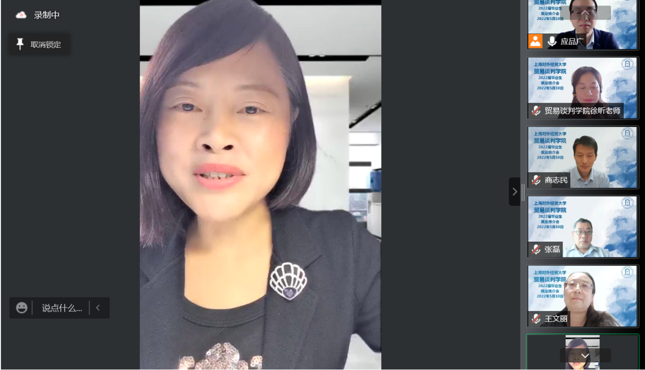 为广泛开拓就业渠道和就业岗位,促进毕业生就业工作,5月10日下午贸易谈判学院通过视频会议形式举办2022届毕业生就业推介会,架好访企拓岗线上“云梯”,吸引多家用人单位参加,推动了就业供需有效对接。贸易谈判学院全体老师出席会议,一起为学生“代言”、向企业问需,为毕业生争取成功求职机会。启动仪式由徐昕副院长主持。