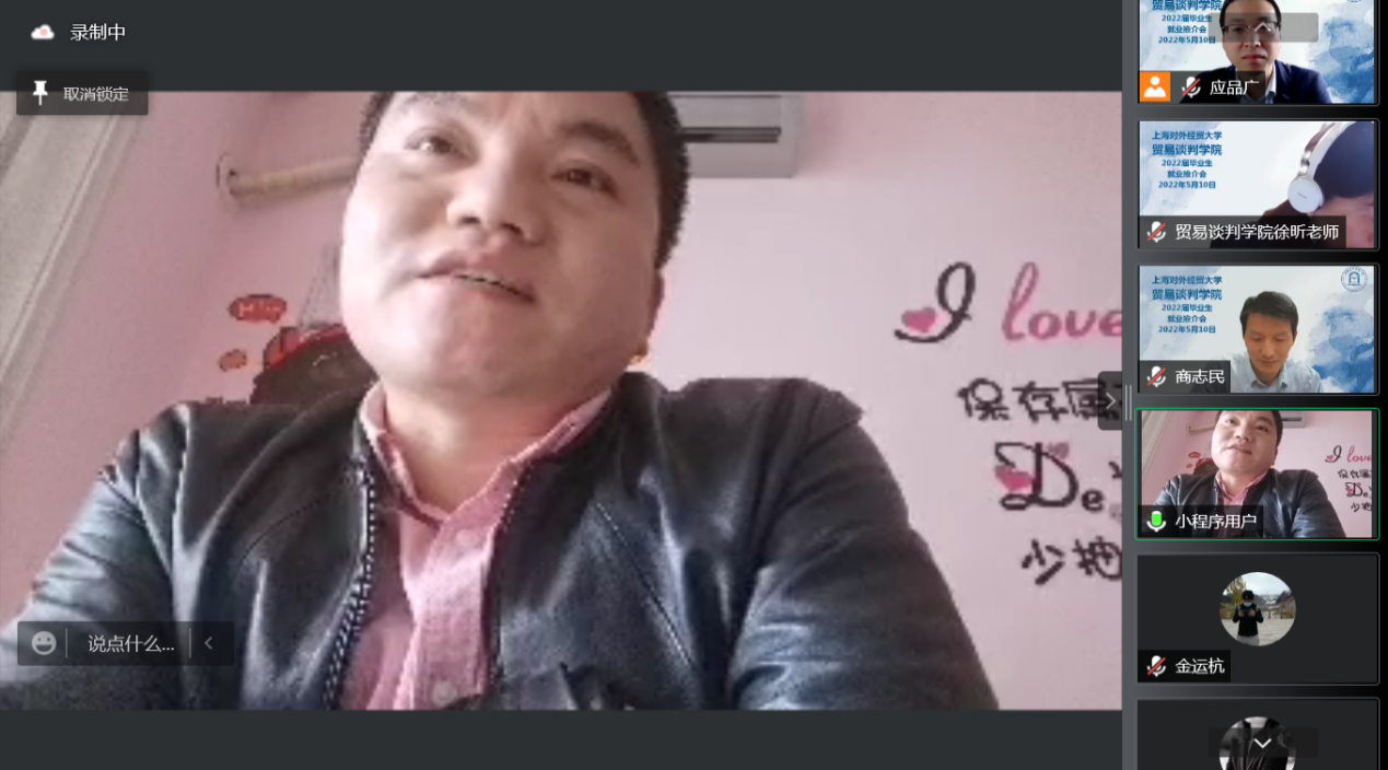 启动仪式后,商志民主持了用人单位宣讲环节。本次就业推介会共邀请到5家单位的相关负责人做了线上宣讲,分别是上海刘春雷律师事务所叶萍党支部书记、上海万赞网络科技有限公司张斌恒总裁、福建至理律师事务所翁启标合伙人、上海鲁匠教育科技有限公司张立秋总裁以及上海其新律师事务所候婷婷律师。