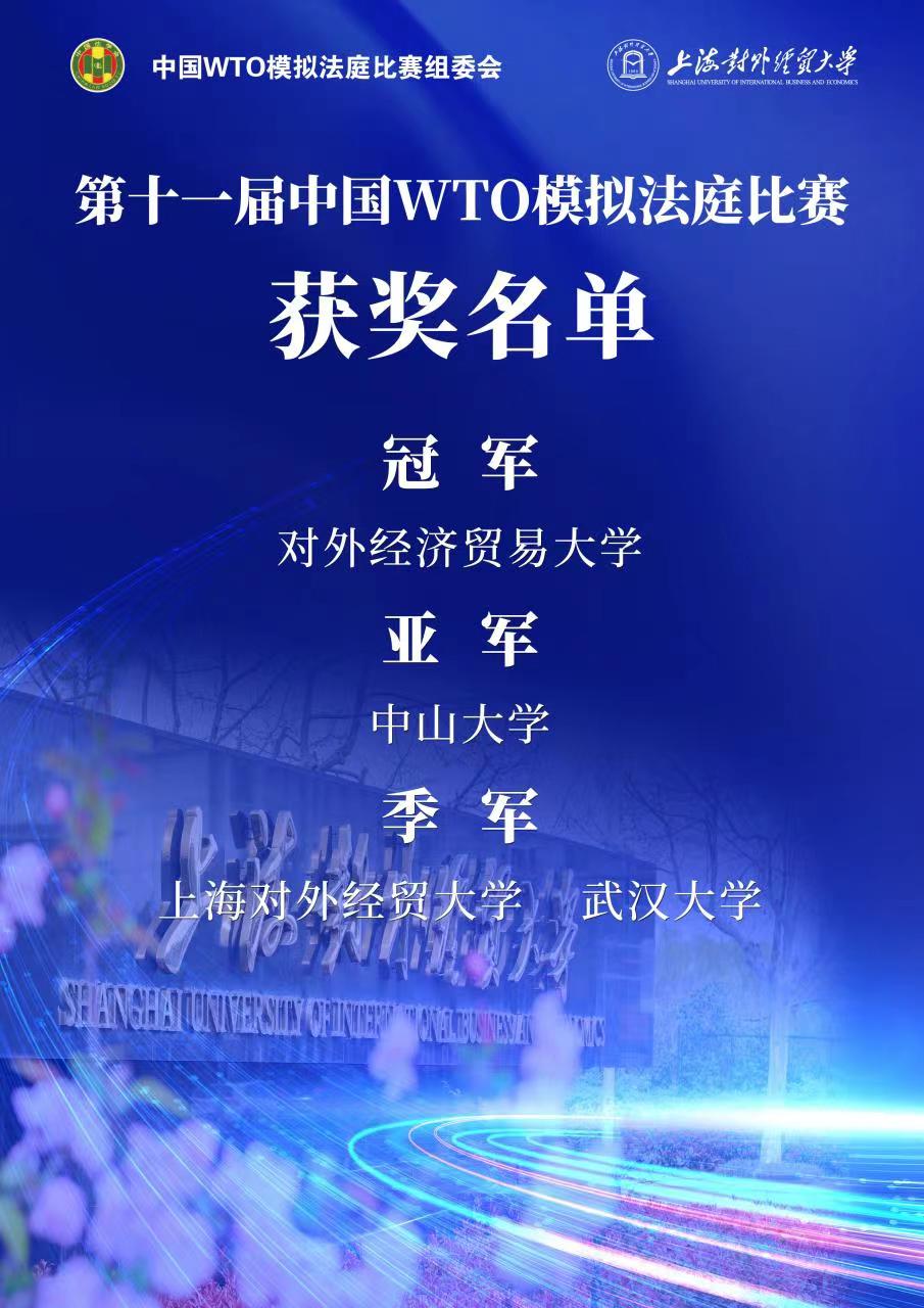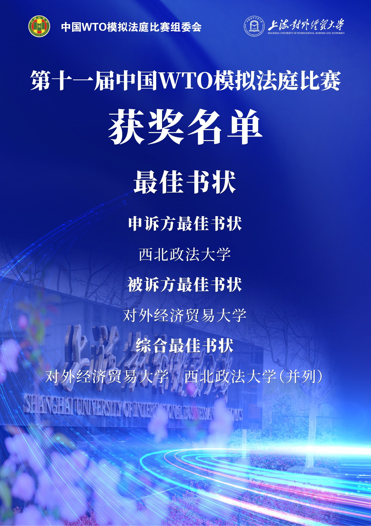 11月27日下午,第十一届“中国WTO模拟法庭竞赛”(China WTO Moot Court Competition)在必赢626net入口首页圆满落幕。本届大赛由中国WTO模拟法庭竞赛组委会和必赢626net入口首页共同主办,同时获得中国政法大学和北京金诚同达律师事务所的大力支持。共有来自全国各地的38支优秀赛队参加。最终,由对外经济贸易大学代表队夺得桂冠,中山大学代表队荣获亚军,必赢626net入口首页、武汉大学代表队荣获季军。