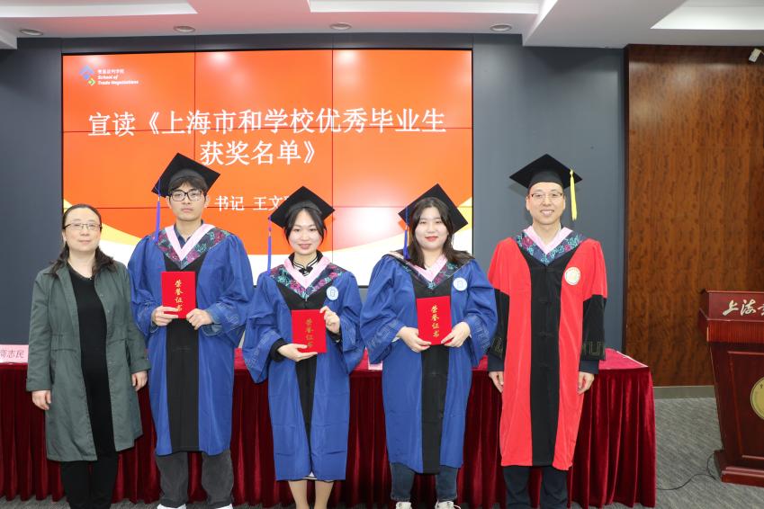 与会领导分别宣读了《硕士学位授予名单》《优秀硕士论文获奖名单》《上海市和学校优秀毕业生获奖名单》。王文丽代表学院向毕业生代表赠送了毕业礼物,并与应品广一起向获得优秀硕士论文获得者和优秀毕业生颁发证书。