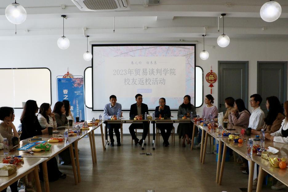 春风送暖,百花迎春。在书香四溢的校园迎来一年中最美好的时刻,4月1日下午,贸易谈判学院在松江校区教工之家举行“春之约话未来”——2023年校友返校日活动。学院党总支书记王文丽,副院长、世界贸易组织讲席(中国)研究院副院长应品广,副院长徐昕、党总支副书记商志民和辅导员辛雅文与返校校友和在校生代表20余人参加本次活动。师生齐集一堂,回忆过去,叙说现在,展望未来.