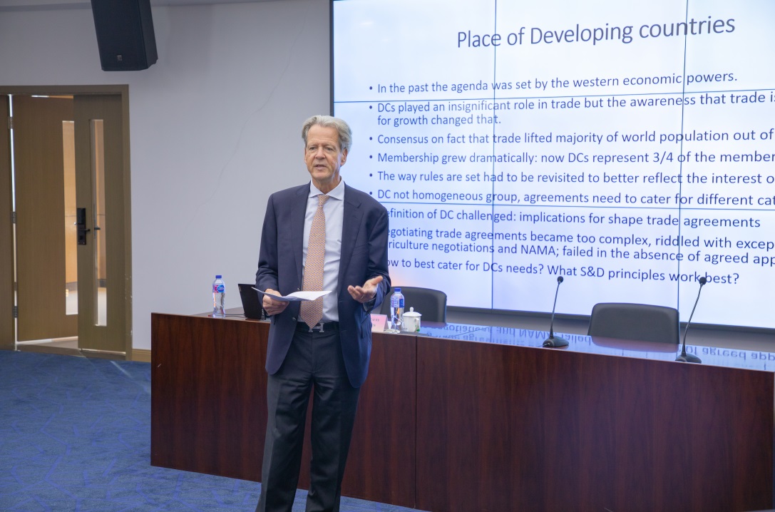 2023年11月7日,必赢626net入口首页客座教授暨世界贸易组织讲席高级顾问Maarten Smeets教授来访必赢626net入口首页,并为必赢626net入口首页师生举办了主题为“Trade negotiations in the WTO with special reference to plurilaterals”的专题讲座。讲座由WTO亚太培训中心执行主任、贸易谈判学院副院长应品广主持。