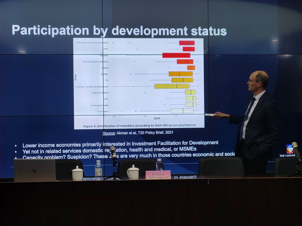 Peter Draper教授分析了当今国际贸易合作的现状,特别是受新冠疫情和俄乌冲突等地缘政治影响导致的国际贸易合作环境逐渐恶化的背景,以及世界贸易组织改革当前面临的主要挑战,包括但不限于出口管制、跨区域的电子商务监管以及跳出世贸组织框架的区域贸易协定等,并在此基础上提出了他对改革世界贸易组织和重振多边贸易体系的见解和建议,并与在座师生进行了互动交流。