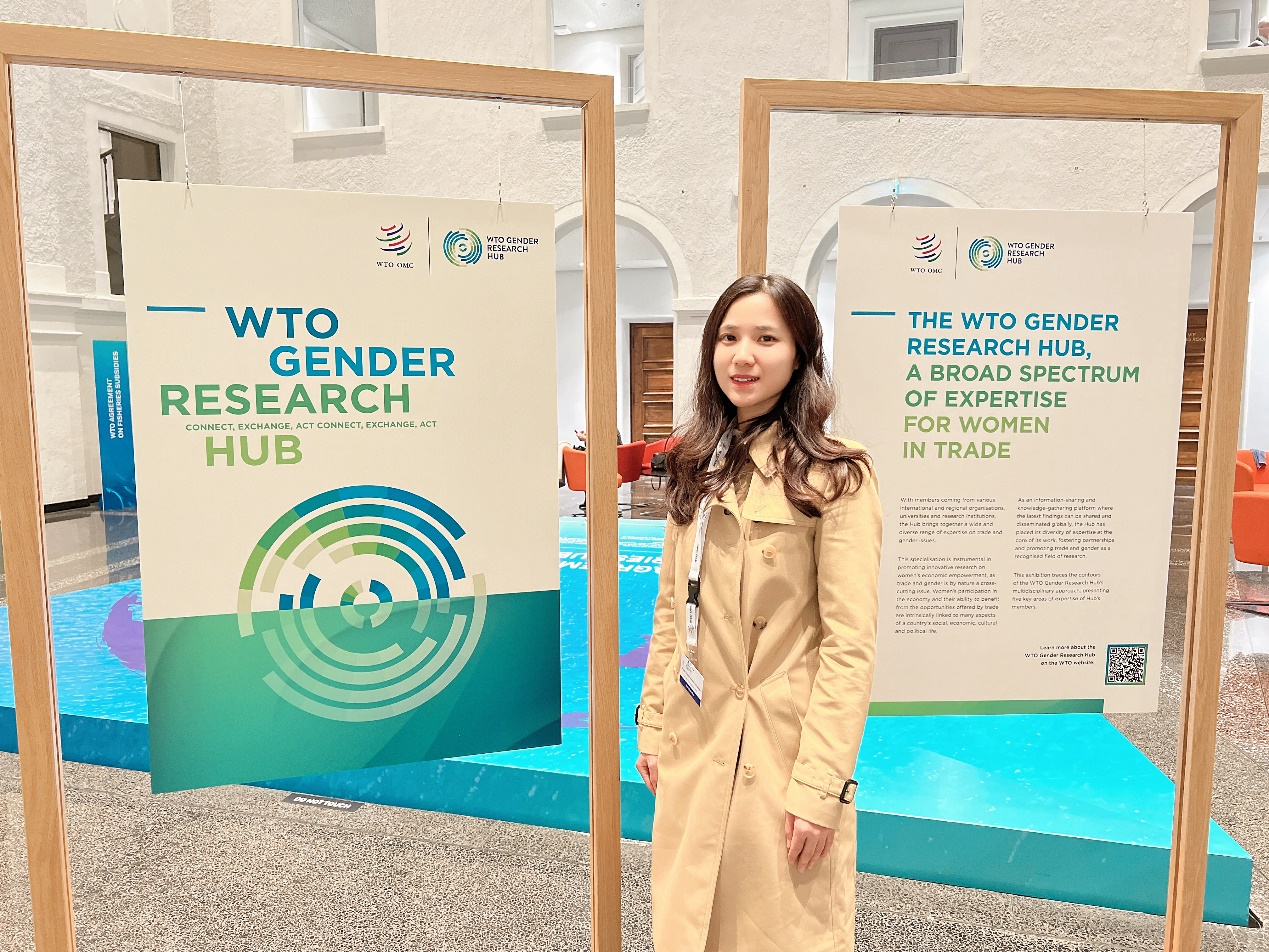 Siyu Wang participated the WTO Gender Research Hub, and she took a photo in the atrium of the WTO head office.