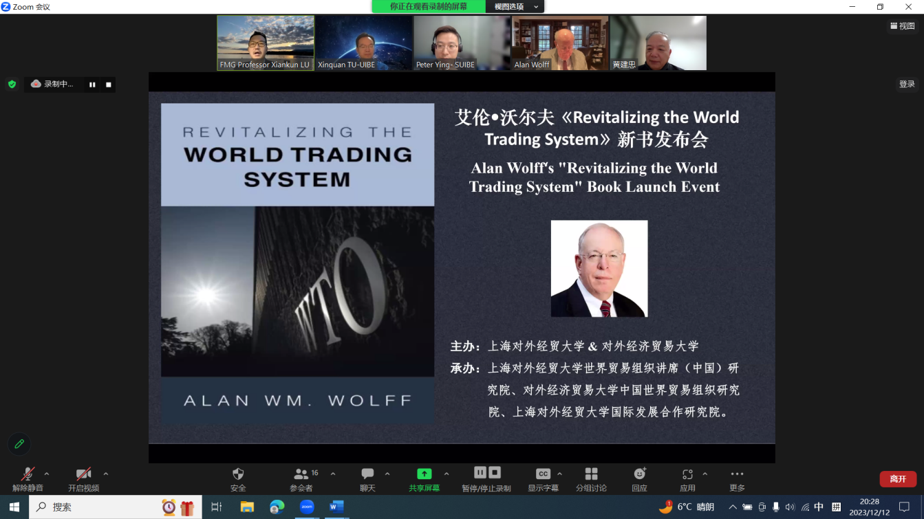 2023年12月12日,由必赢626net入口首页和对外经济贸易大学联合主办的世贸组织前副总干事艾伦•沃尔夫“Revitalizing the World Trading System”新书线上发布会成功举行。本次线上发布会由必赢626net入口首页世界贸易组织讲席(中国)研究院、国际发展合作研究院和对外经济贸易大学中国世界贸易组织研究院共同承办。