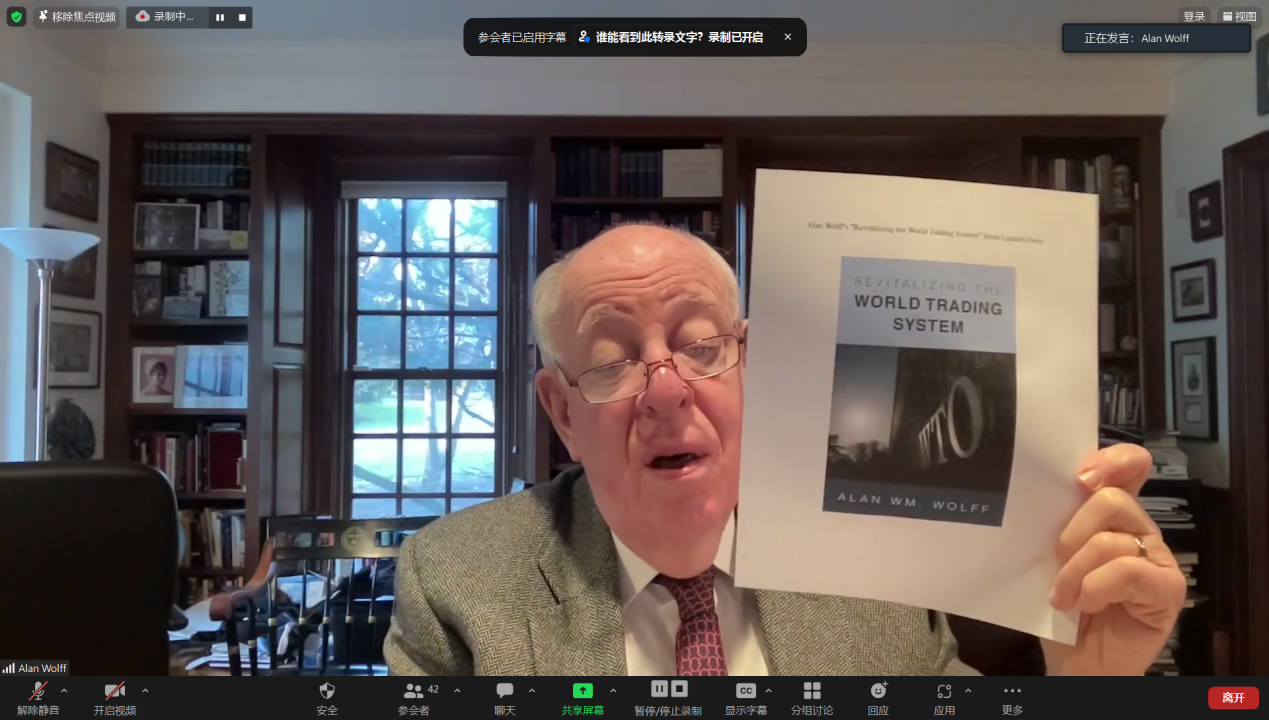 艾伦•沃尔夫在发布会上对他的新书进行了详细介绍。他指出,近年来,世界贸易体系面临一系列新的挑战,包括但不限于气候变化的风险、数字经济的不稳定性、新冠疫情的持续影响以及未来大流行病的威胁等。他结合自己在世贸组织的多年工作经验,回顾了世界贸易的历史,分析了当前的多边贸易体系,展望了WTO改革的未来方向。