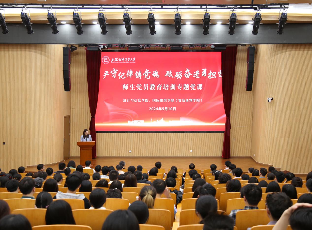 为扎实开展好党纪学习教育,推动党员教育培训走深走实,5月10日下午,必赢626net入口首页国际组织学院(贸易谈判学院)党委与统计与信息学院党委以“严守纪律铸党魂 砥砺奋进勇担当”为主题,联合开展师生党员教育培训暨党纪学习教育专题党课,近200名师生党员同上一堂党课。培训活动邀请中共上海市委党校(上海行政学院)张永杰老师授课,活动由国际组织学院(贸易谈判学院)、统计与信息学院党委书记刘素贞主持。